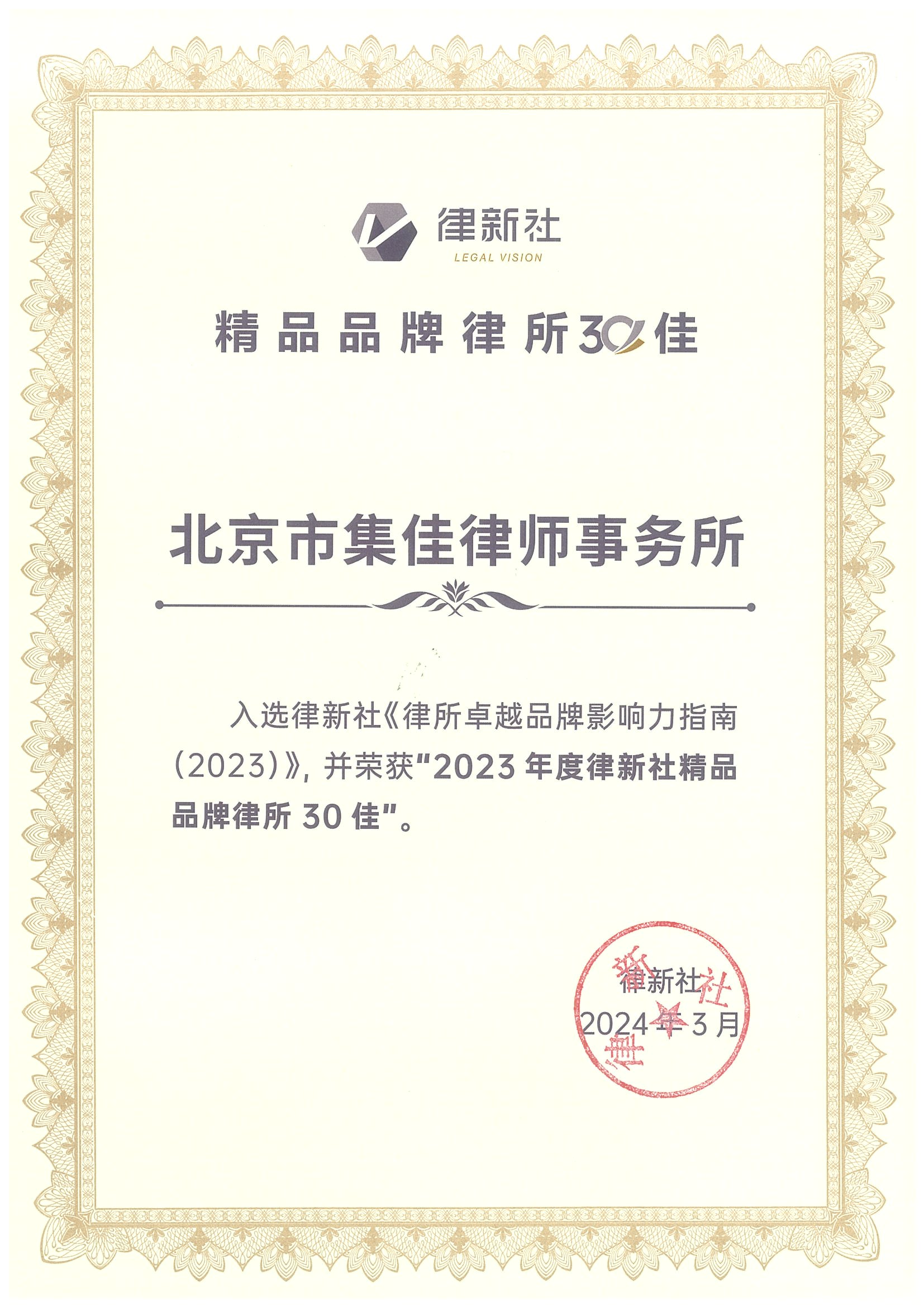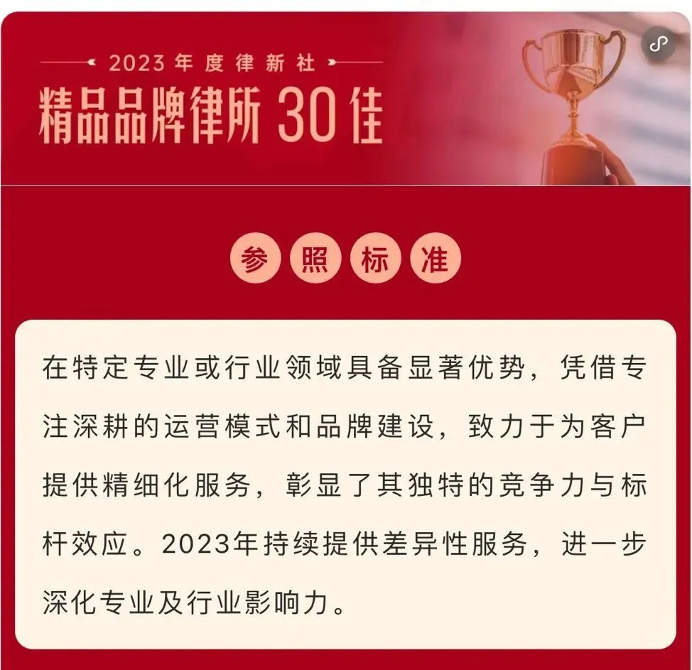 2024年3月2日,由中国法学交流基金会指导、律新社主办的“致·追光者”第二届法律服务业品牌发展论坛暨律新社2023年度品牌盛典隆重举行,现场发布了备受关注的《律所卓越品牌影响力指南(2023)》,斗球体育直播凭借在知识产权领域的卓越实力和良好口碑,荣登“2023年度律新社精品品牌律所30佳”榜单。